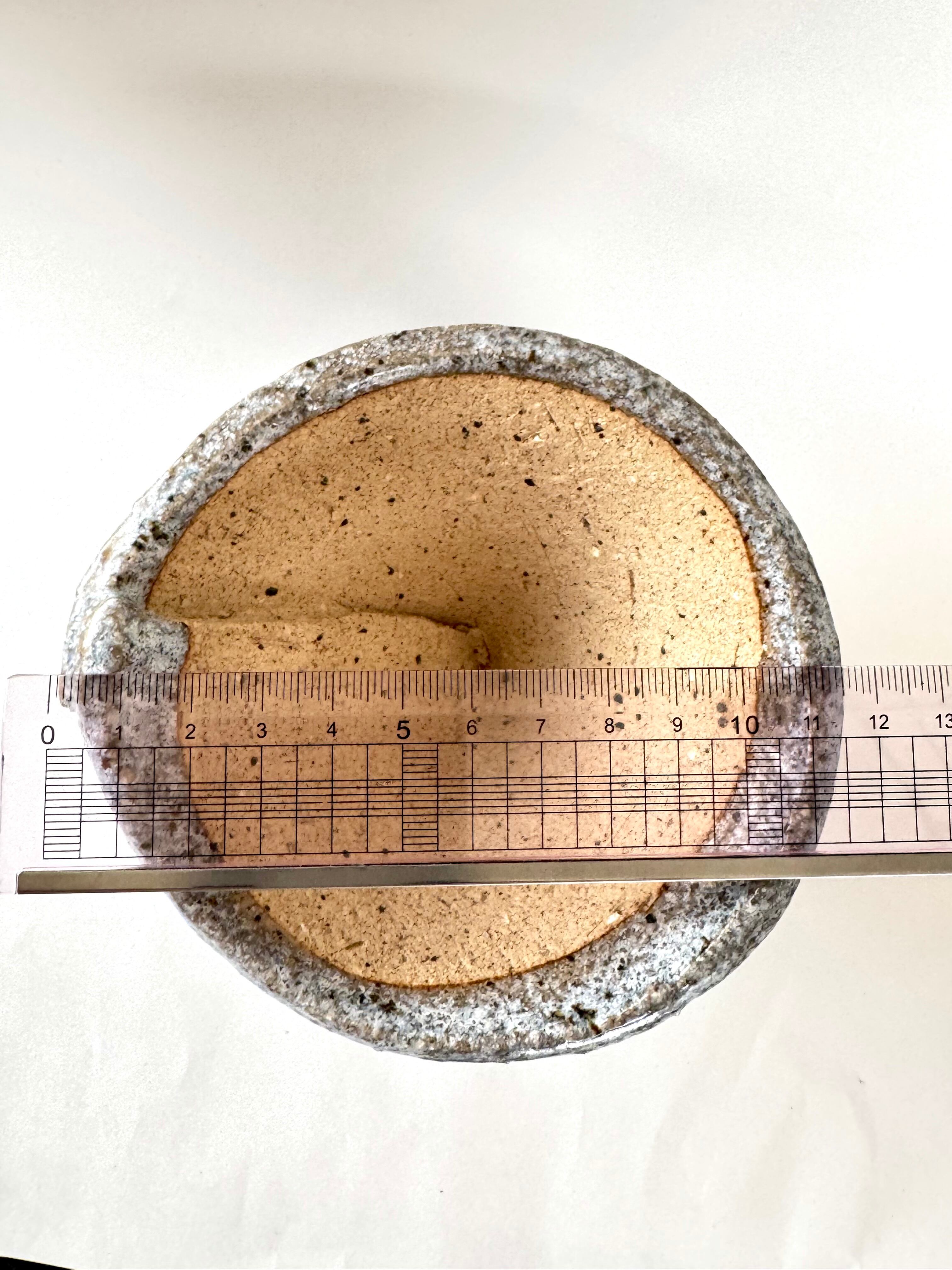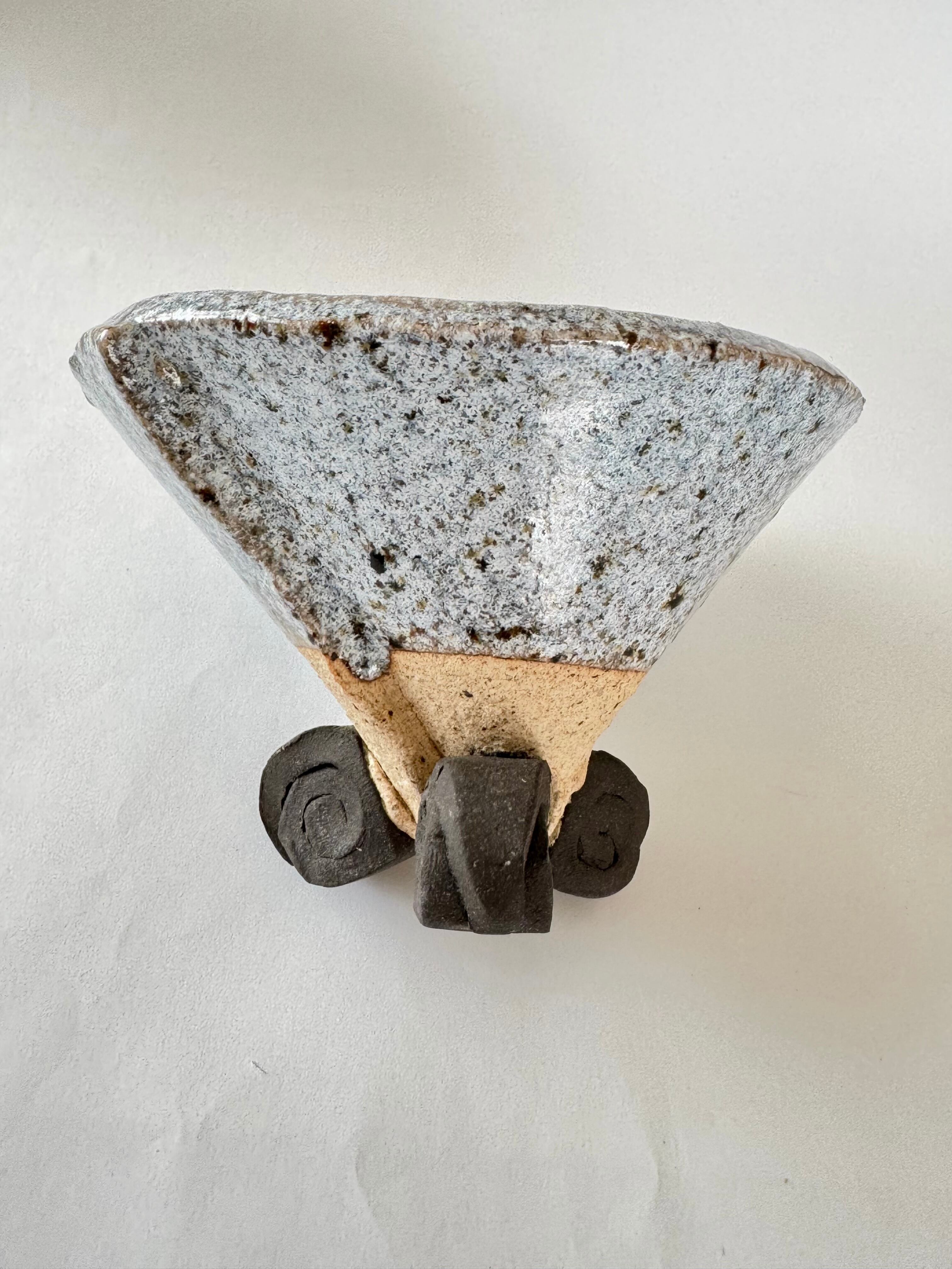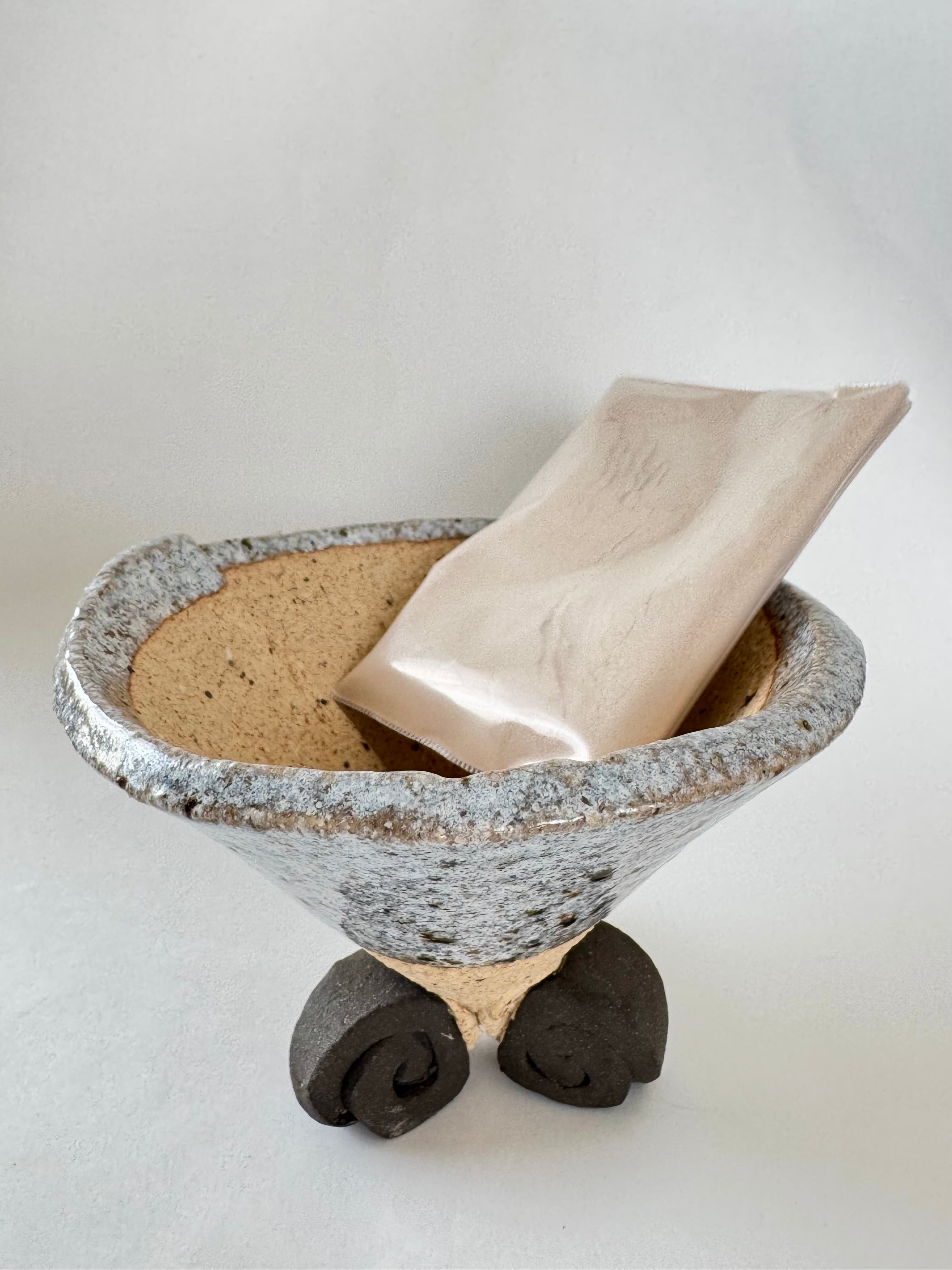 信楽焼(足付き) グレーと土の色点々のアクセントが入っており、とても可愛らしくPOP感もあります。手作り品で、三足は渦巻き状で焦茶色です。
